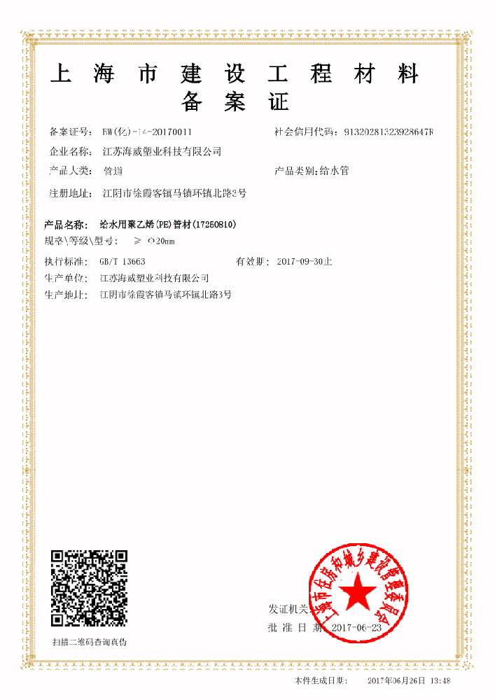 公司已经获得上海建材备案证